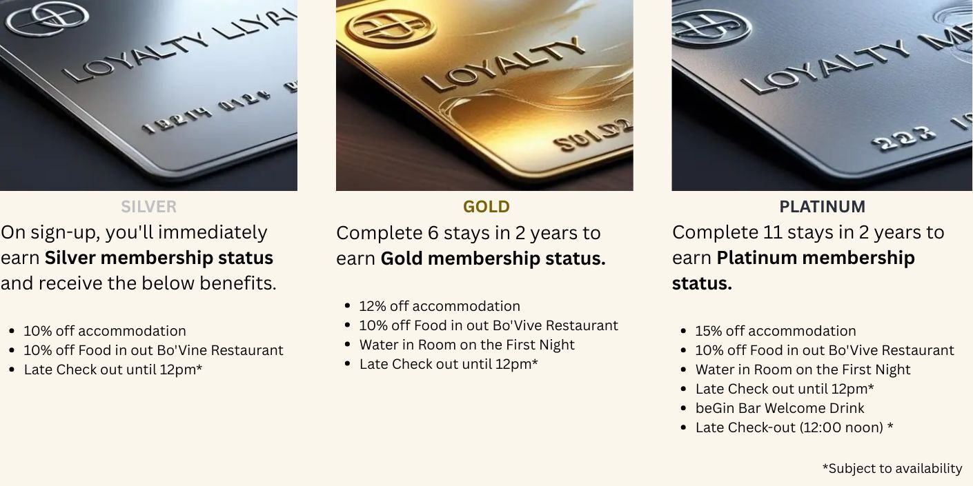 Enjoy 10%–15% off your bedroom stays just by joining. Plus, take advantage of food discounts at our on-site restaurants and bars. The more you stay, the more you save — it really is that simple.